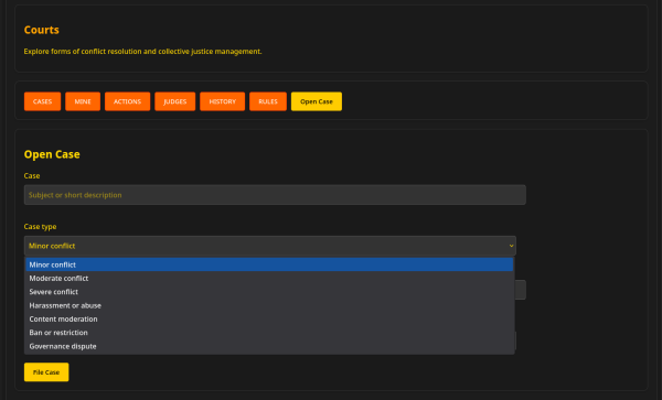 The Courts module lets people open cases, choose different decision methods (judge, popular vote, mediation, etc.), and keep a transparent record of everything that happens: evidence, hearings, verdict, and possible appeals.
