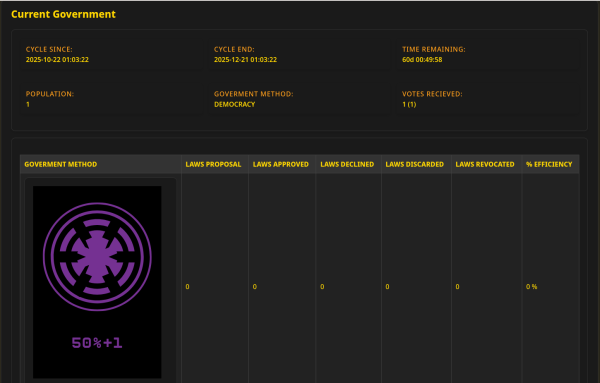 - Proposals: If you are the ruling inhabitant or part of the ruling tribe, you can publish law proposals. Non-dictatorship methods create a public voting process.